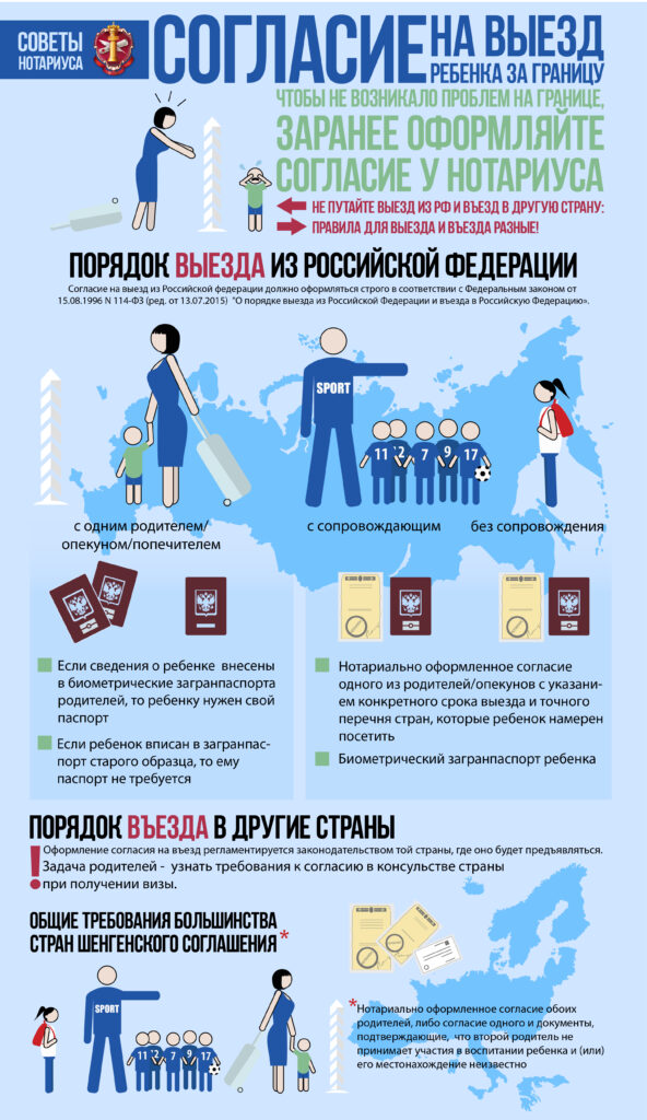По законам Российской Федерации, если несовершеннолетний гражданин (лицо, не достигшее 18-летнего возраста — ред.) выезжает из страны вместе с хотя бы одним из родителей, усыновителей, опекунов или попечителей — согласия на выезд ребенка за границу от второго родителя не требуется. Важно не забывать, однако, что речь идет только о выезде ребенка из Российской Федерации, а не о въезде в другую страну. Есть два вида согласий: есть согласие родителей на выезд ребенка, которое предназначается для предъявления сотрудникам пограничной службы Российской Федерации, оно должно оформляться строго в соответствии с федеральным законом о порядке выезда из РФ и въезда в РФ; второй вид –  согласия, которые требуют консульские учреждения и посольства для оформления визы ребенка. Как будет оформляться согласие для получения визы, регламентируется законодательством той страны, куда оно будет предъявляться.